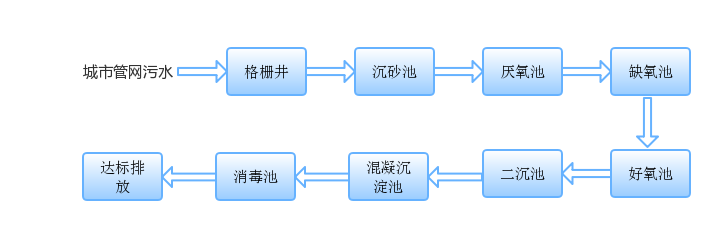 基于城市污水的特性,其工藝一般采用“格柵+沉砂池+A2/O+二沉池+絮凝沉淀+紫外消毒”。城市管網(wǎng)污水進(jìn)入系統(tǒng)后,首先經(jīng)過格柵井?dāng)r截大體積漂浮物,然后進(jìn)入沉砂池去除夾帶的泥沙等懸浮物。沉砂池出水進(jìn)入生化單元,在此單元進(jìn)行脫碳、脫氮除磷,該單元分別由厭氧池、缺氧池、好氧池和二沉池構(gòu)成,污水經(jīng)過二沉池的泥水分離后,各項(xiàng)指標(biāo)基本達(dá)標(biāo),但由于泥水分離不徹底,因此經(jīng)過混凝沉淀,去除懸浮物和可能超標(biāo)的總磷,最后經(jīng)過紫外消毒,殺滅病毒病原體。