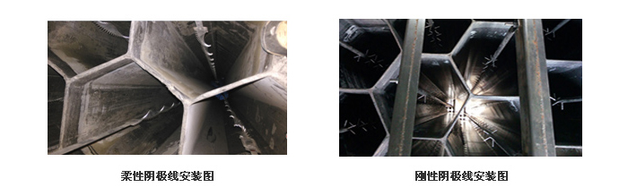 陰極線通常采用2205材質。剛性針刺線相比較柔性陰極線,降低了起暈電壓,大幅提高了線電流密度,伏安特性優于柔性線。上下部均設固定點,防止煙氣通過時擺動,滿足高氣速對陰極系統穩定性的特別要求。