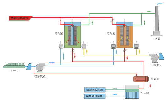 吸附回收主要是利用吸附材料將廢氣中的有機溶劑吸附下來,并脫附回收利用有機溶劑的方法。