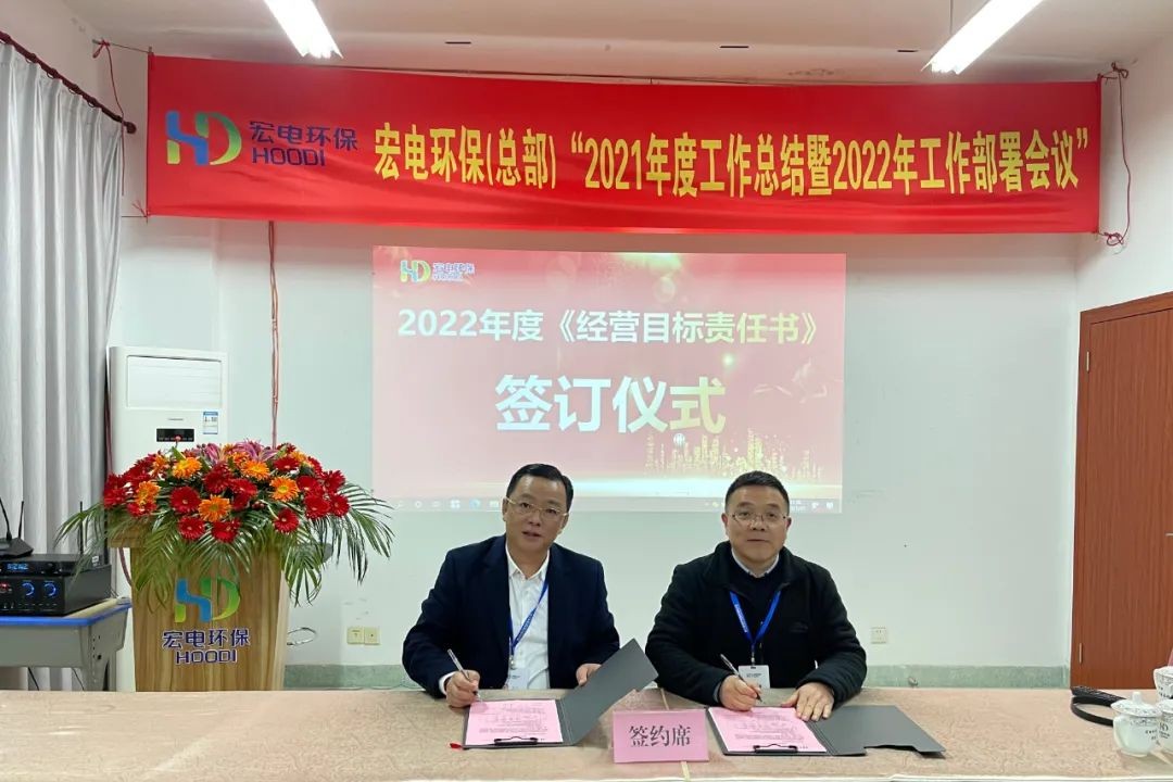 宏電環保鄒可興董事長以《凝心聚力共奮進,同心逐夢譜新篇》為主題,代表公司作了2021年度工作總結和2022年度工作部署,并分別同各事業板塊分管領導簽訂了2022經營目標責任書。