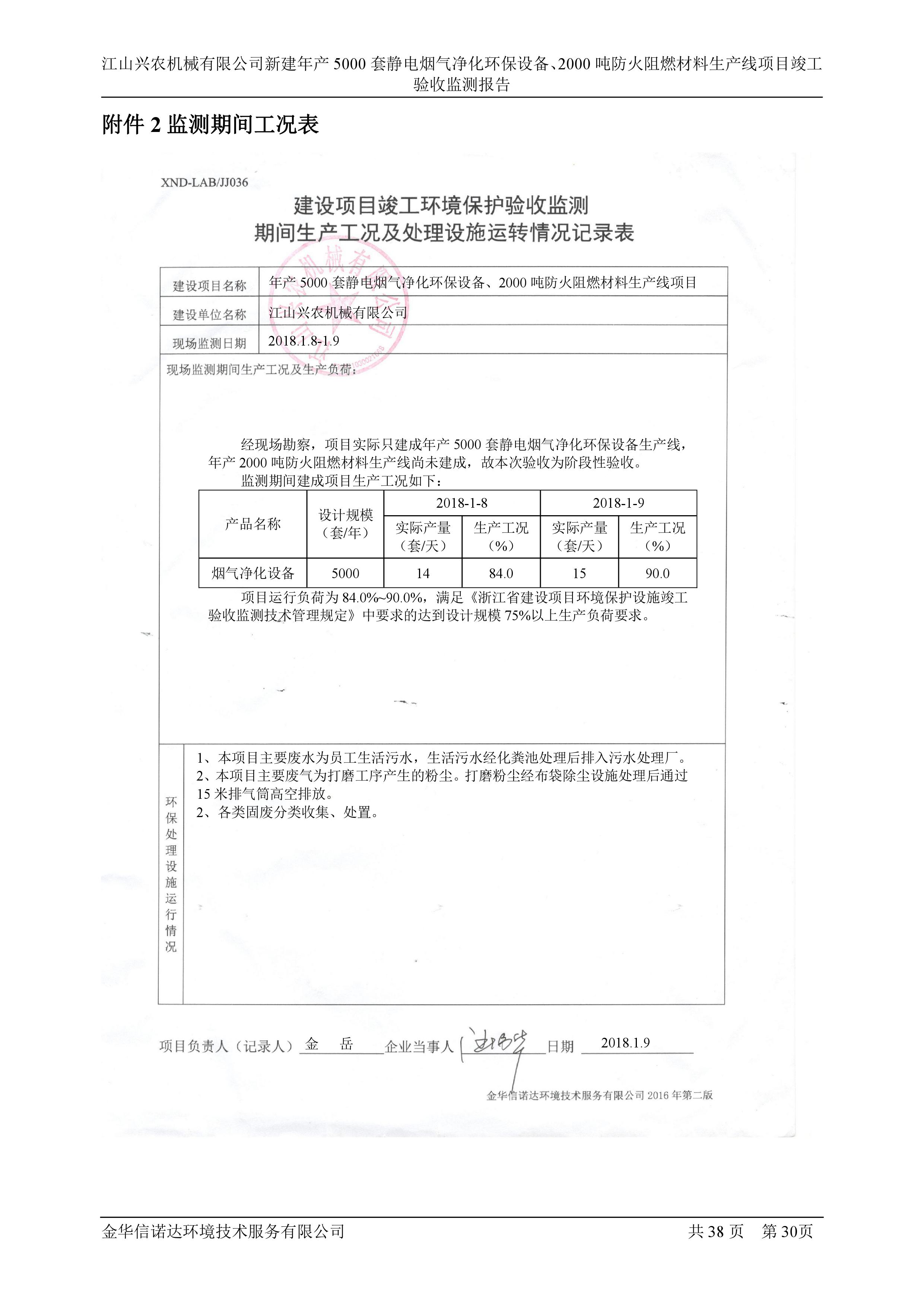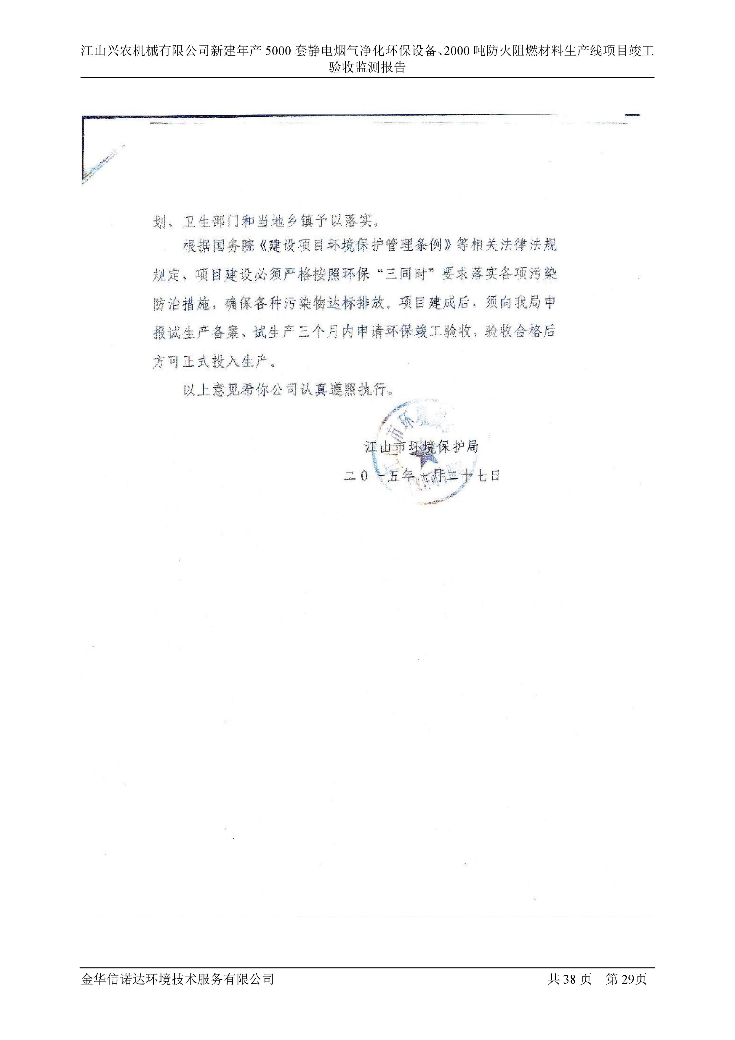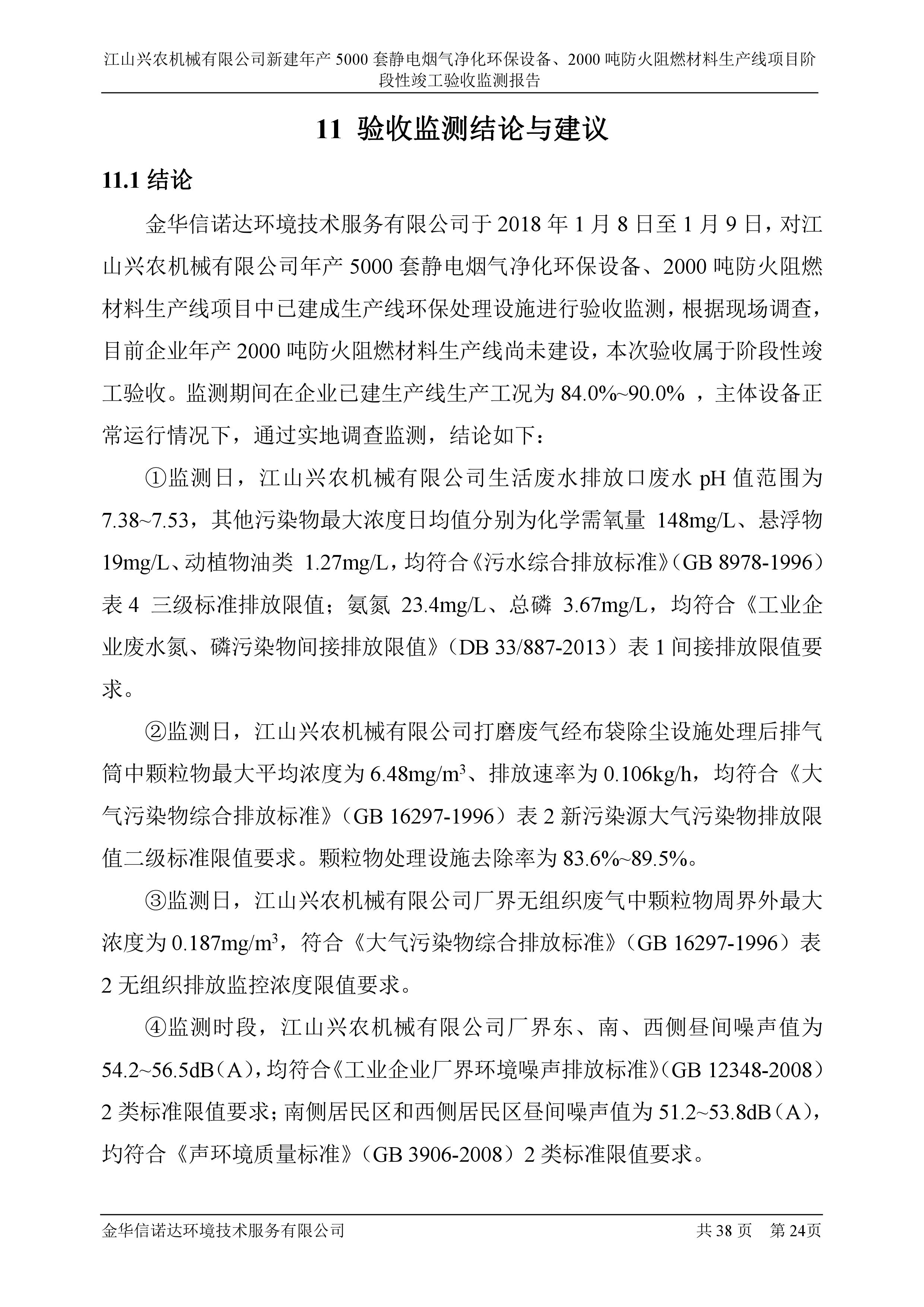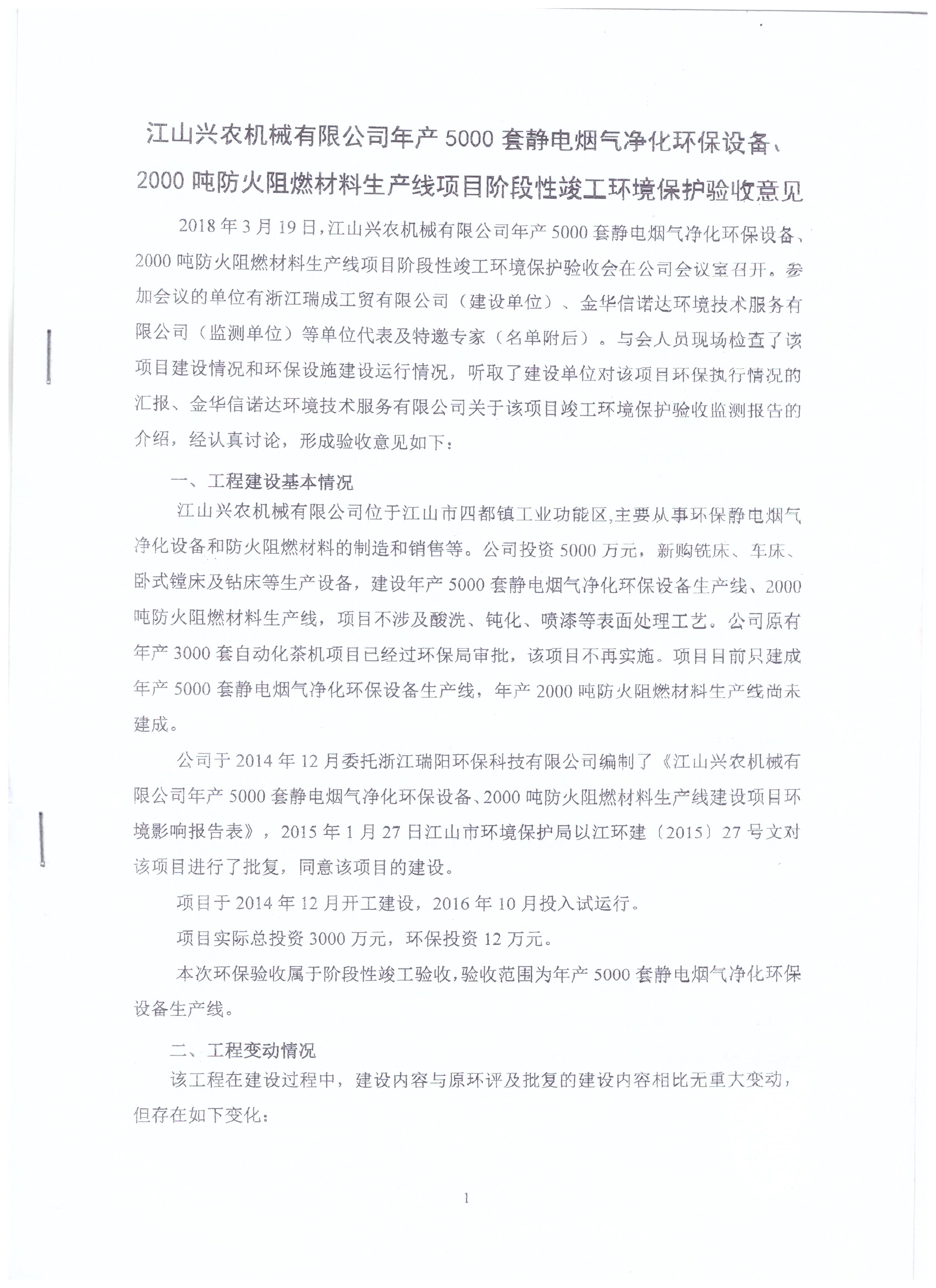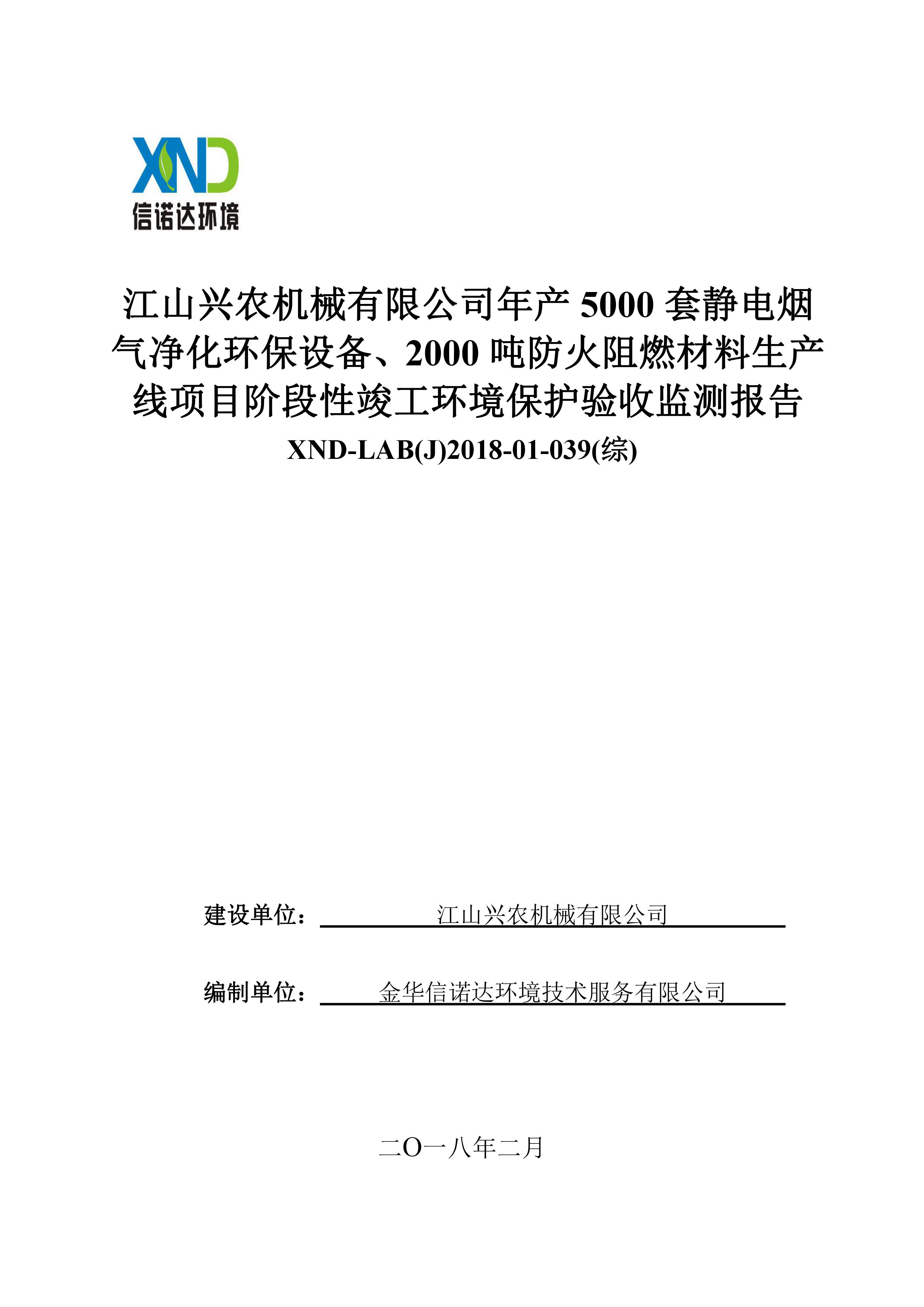 江山興農機械有限公司年產5000套靜電煙氣凈化環保設備、2000噸防火阻燃材料生產線項目階段性竣工環境保護驗收監測報告公示