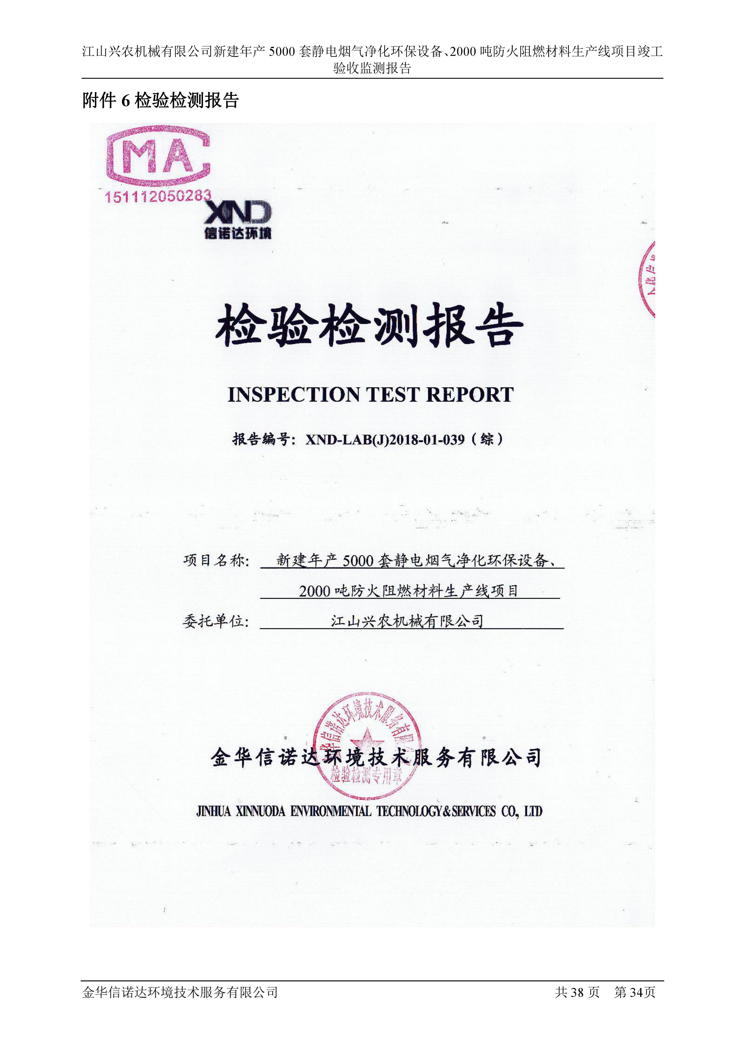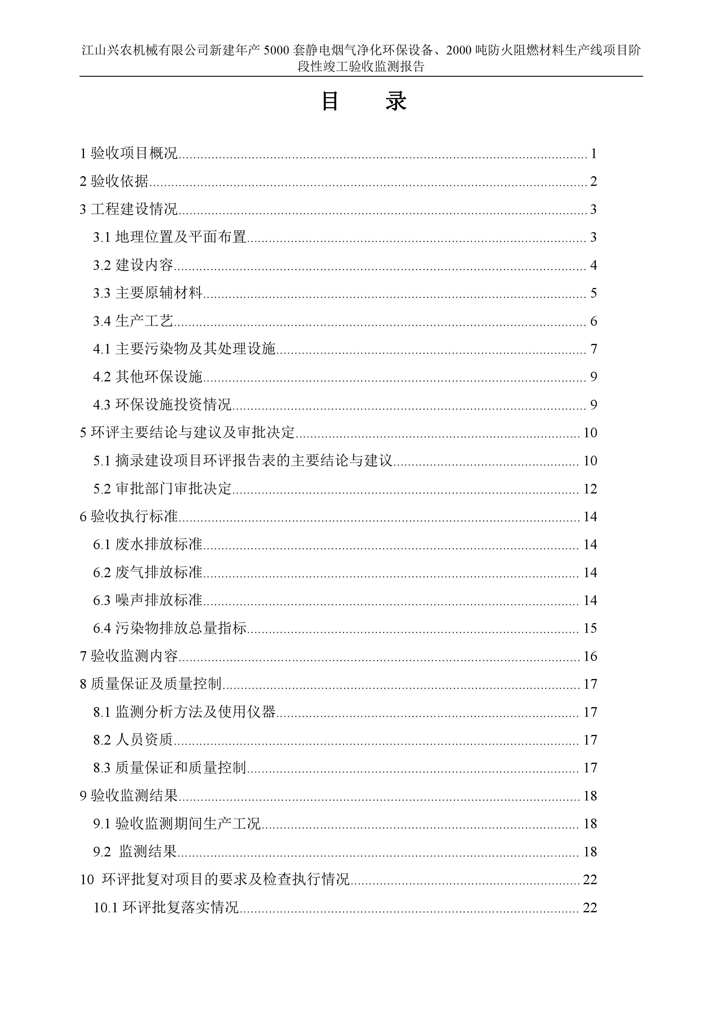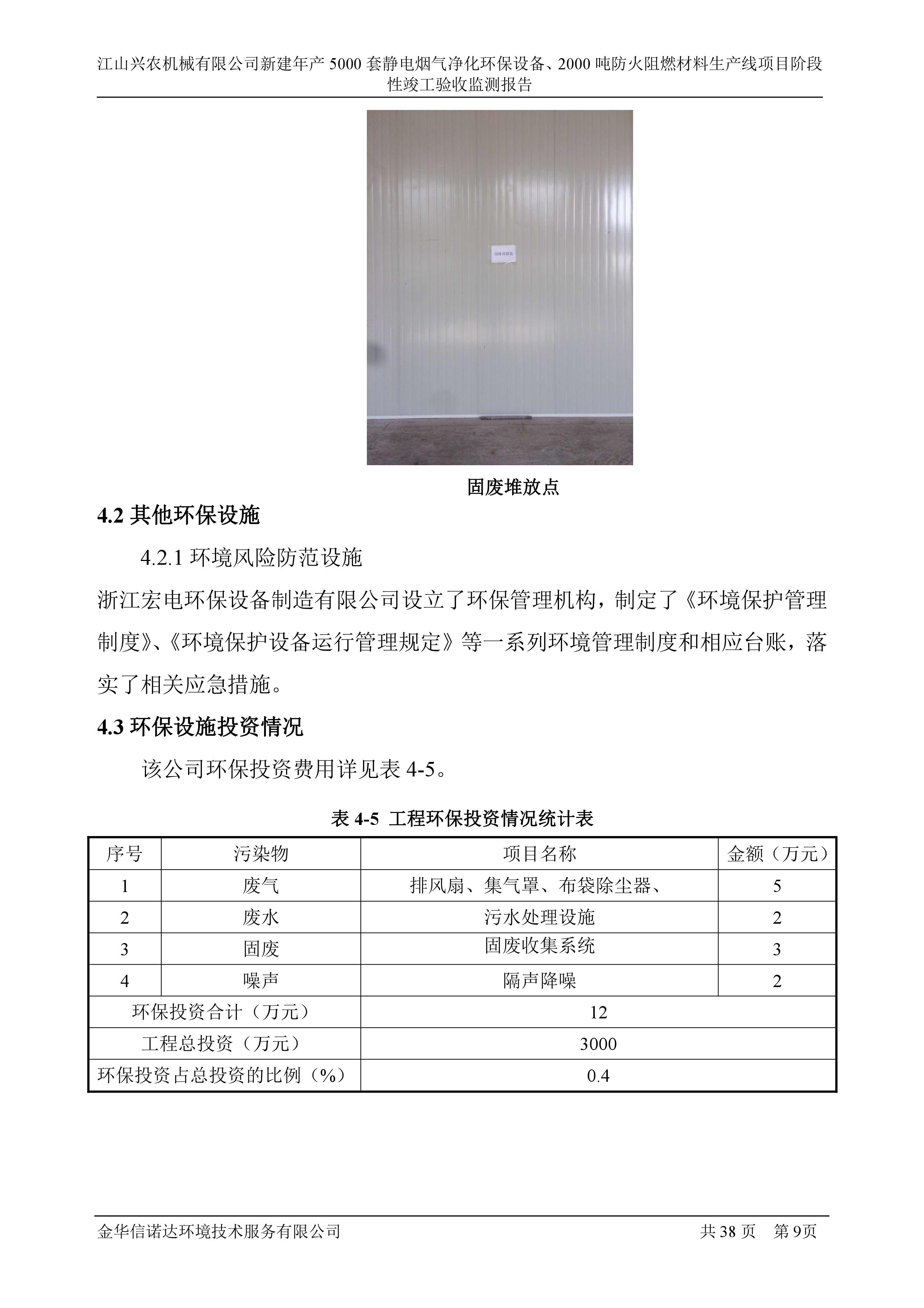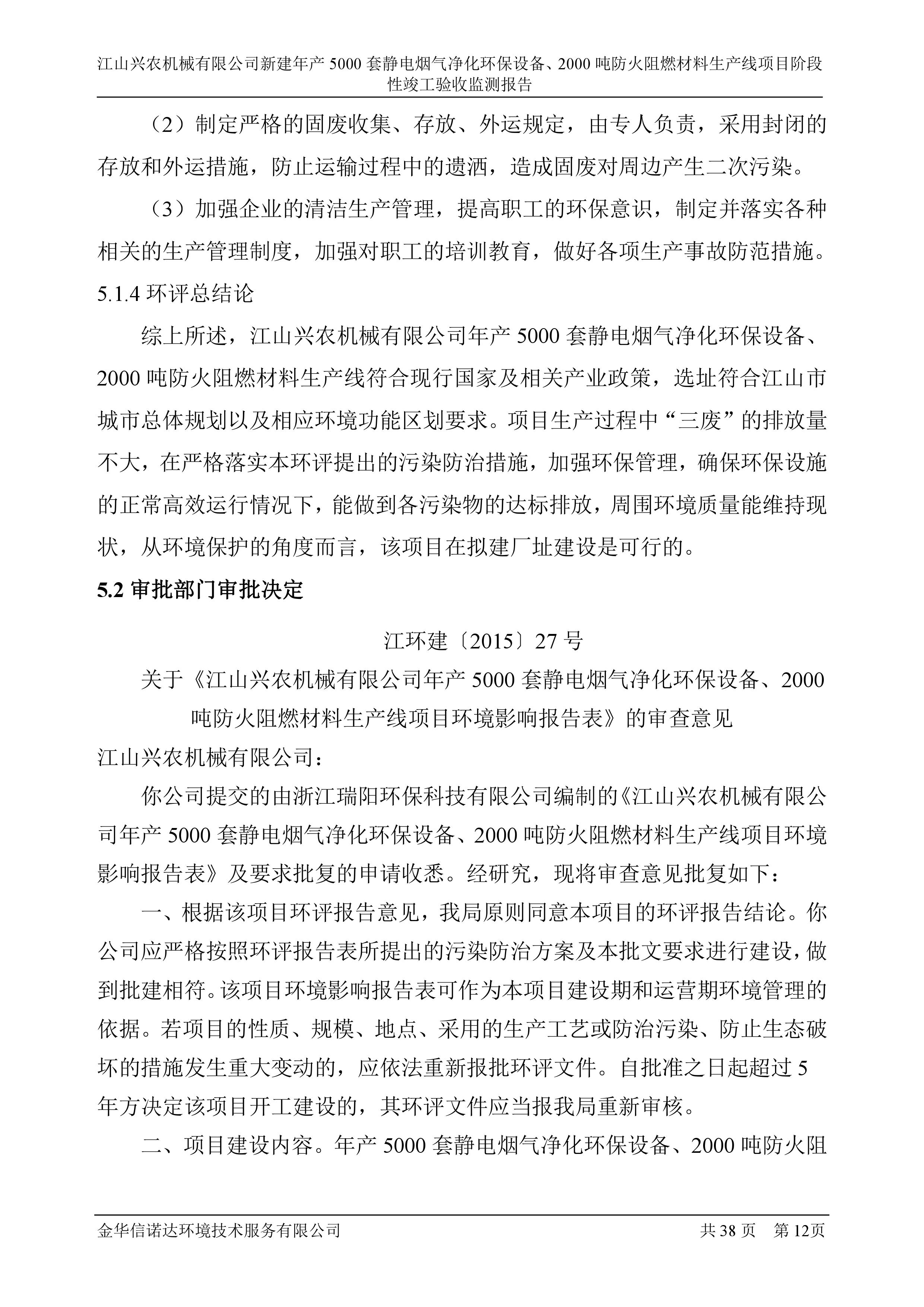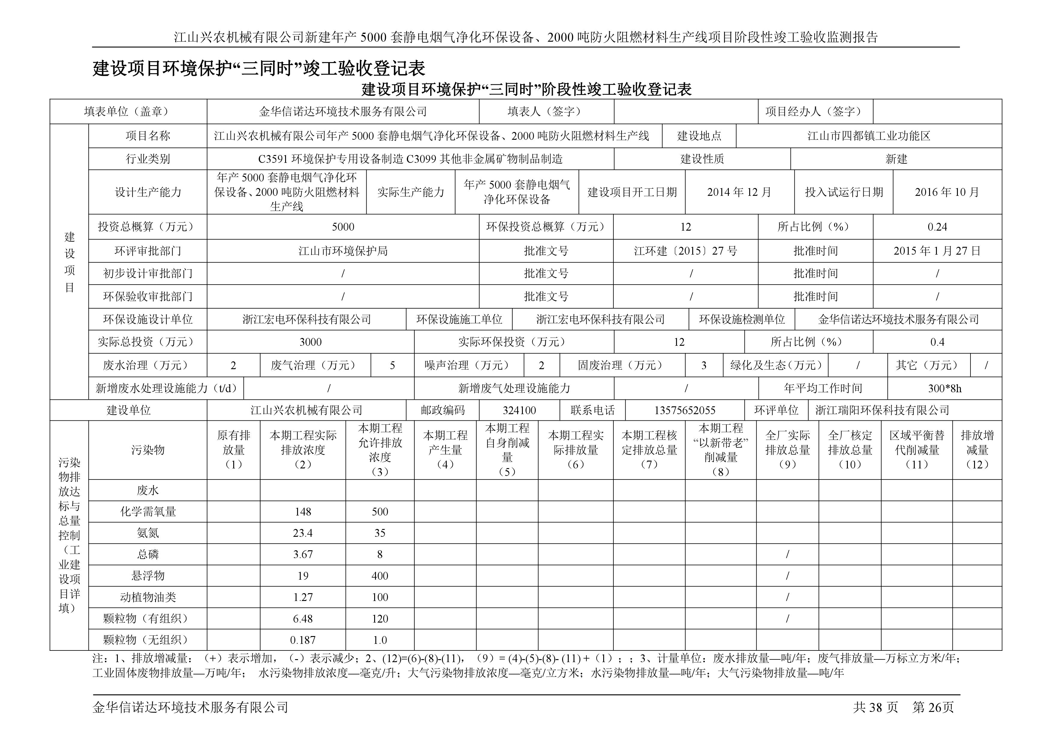 江山興農機械有限公司年產5000套靜電煙氣凈化環保設備、2000噸防火阻燃材料生產線項目階段性竣工環境保護驗收監測報告公示
