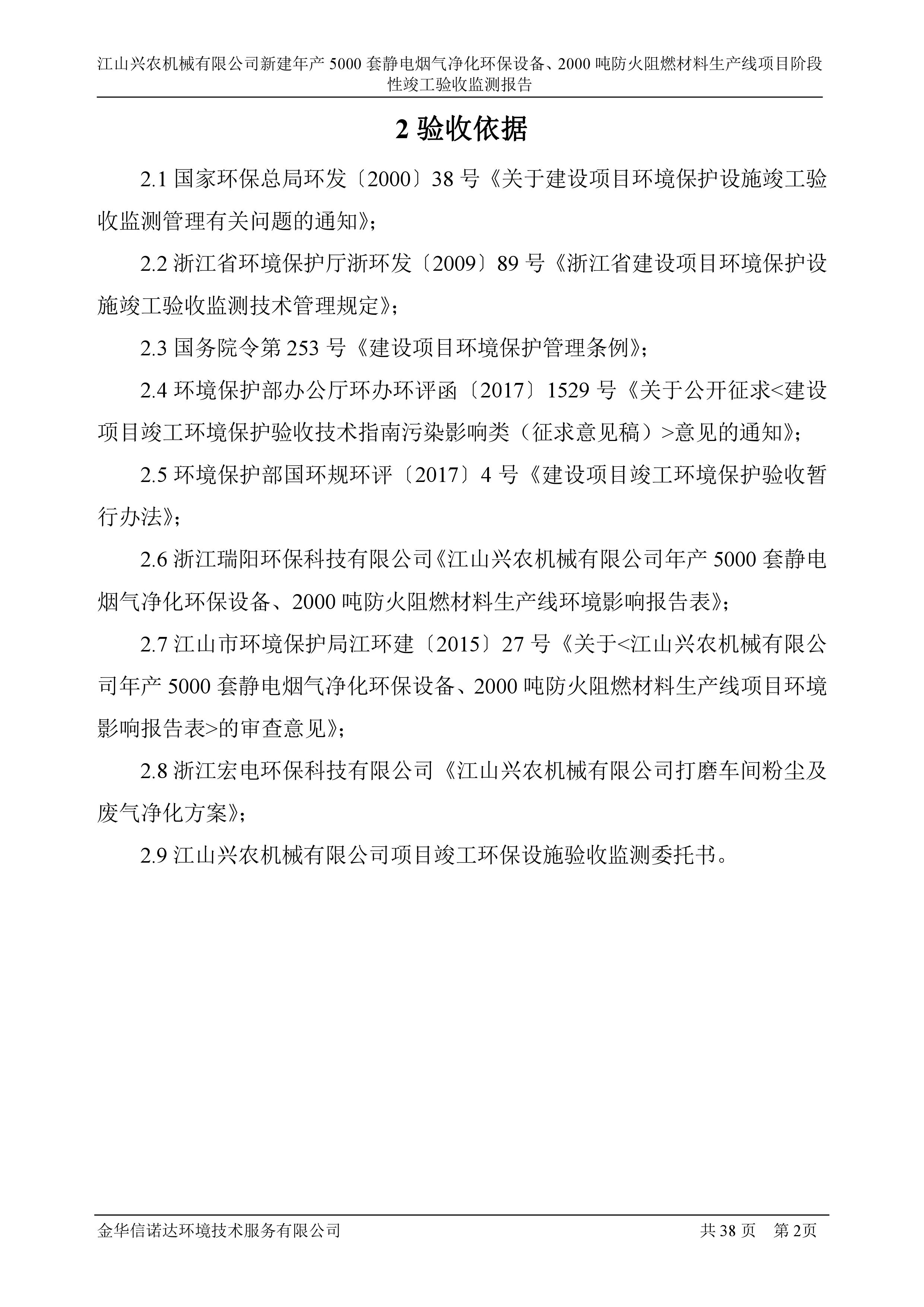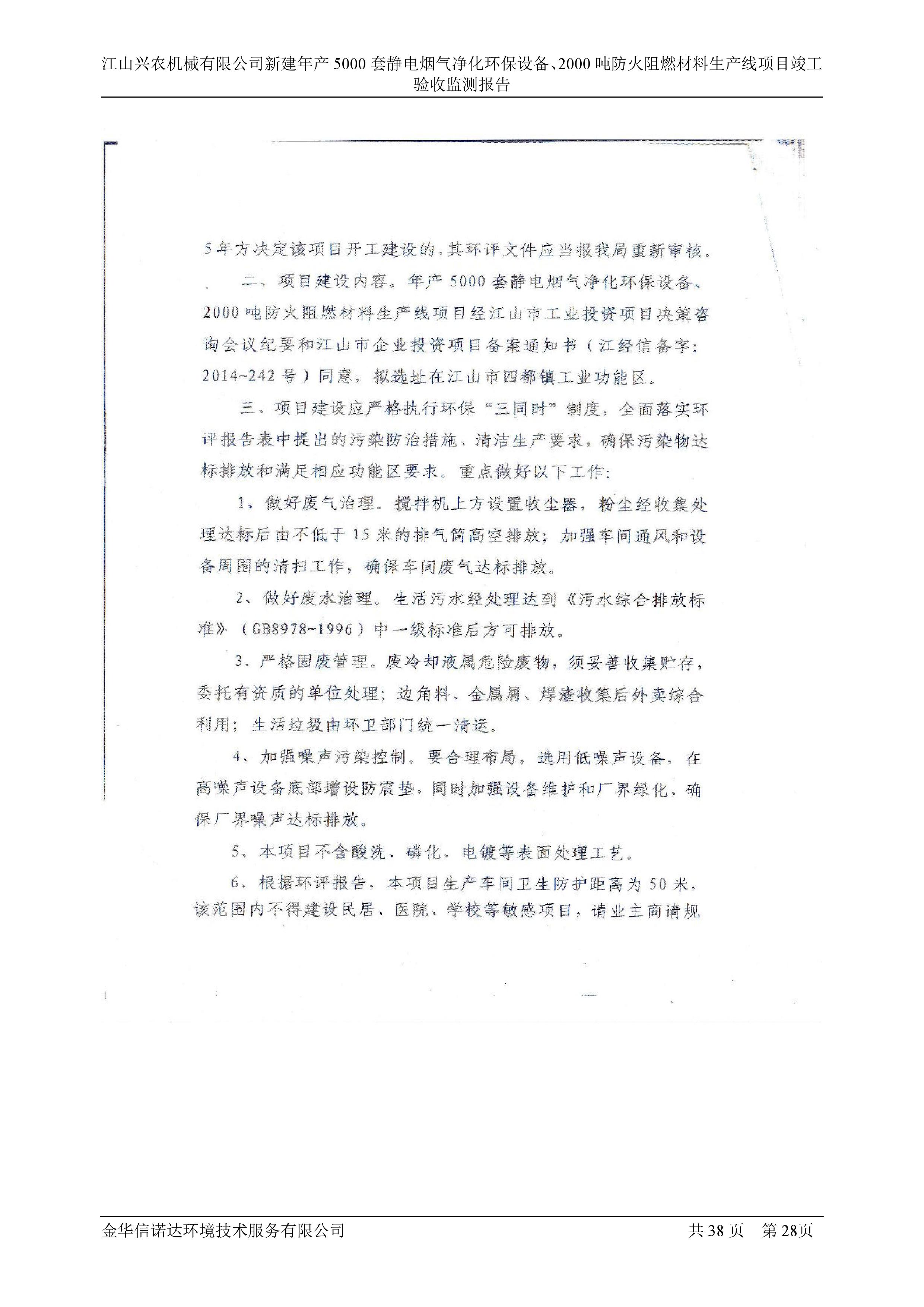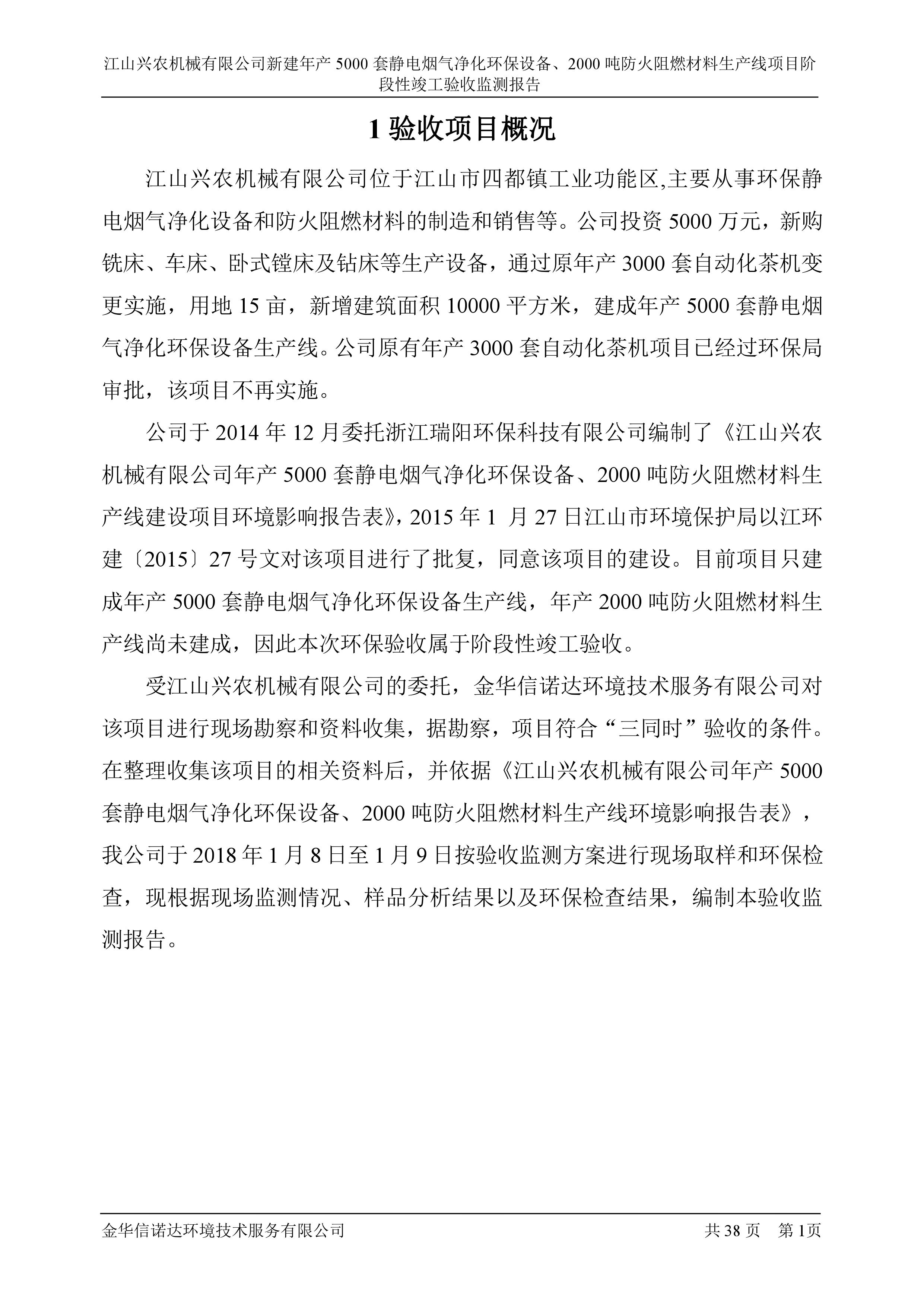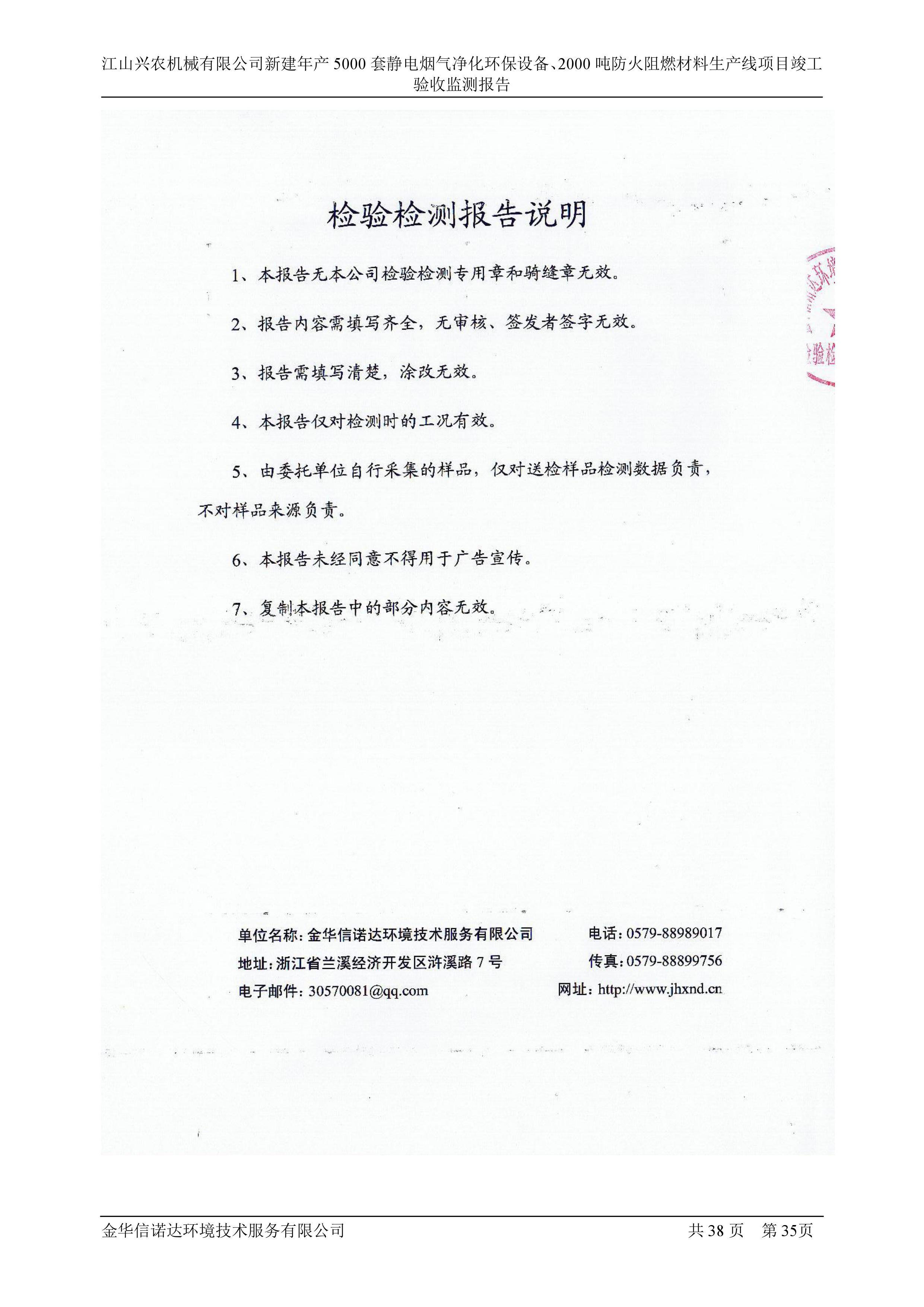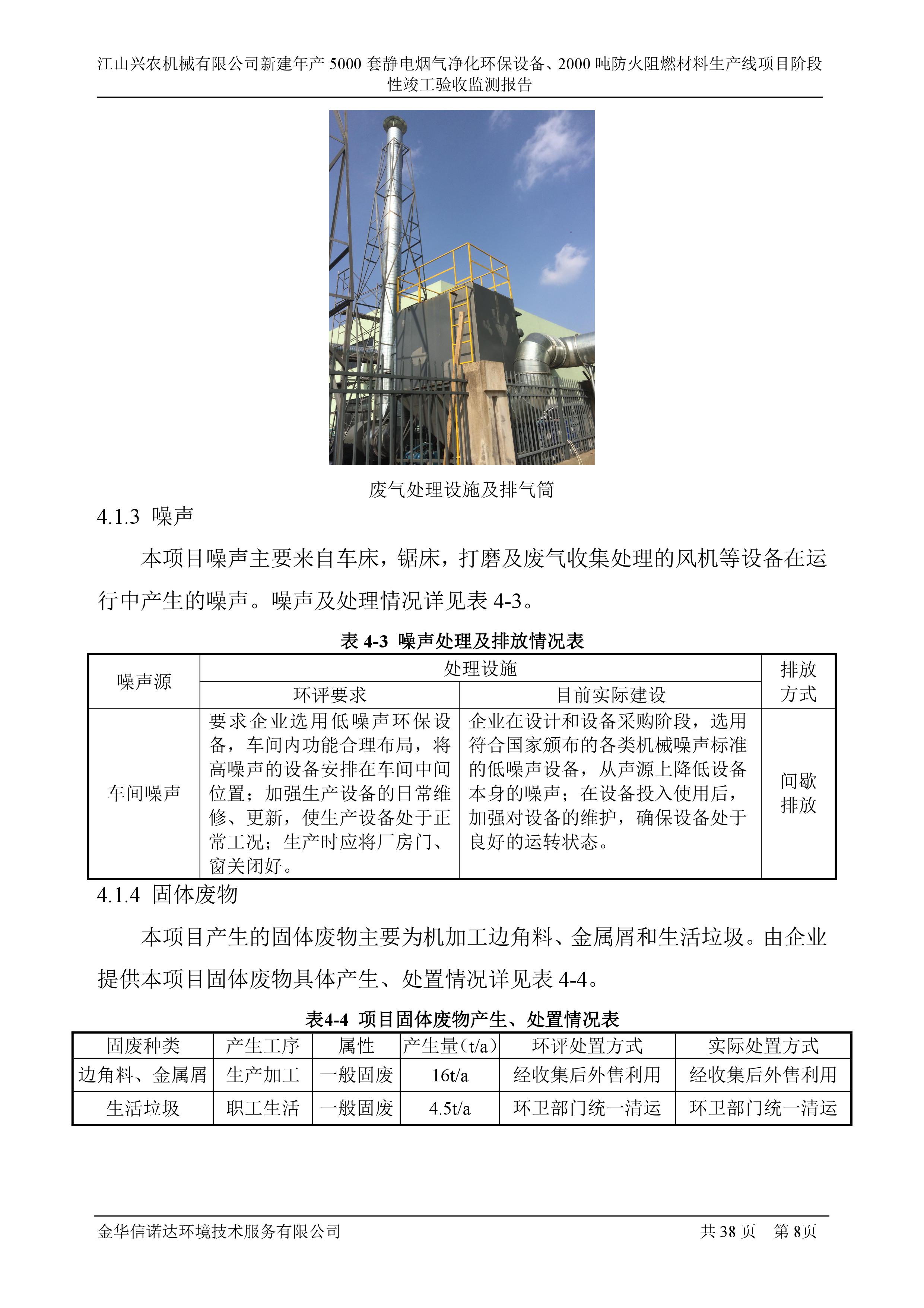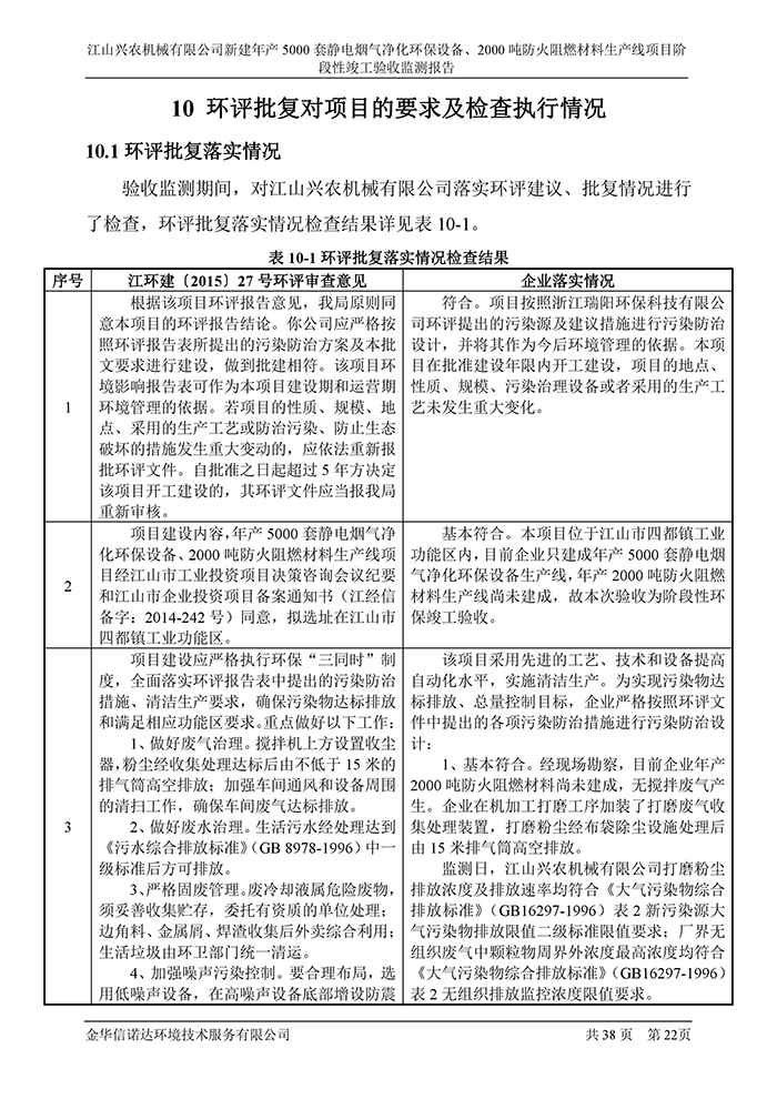 江山興農機械有限公司年產5000套靜電煙氣凈化環保設備、2000噸防火阻燃材料生產線項目階段性竣工環境保護驗收監測報告公示