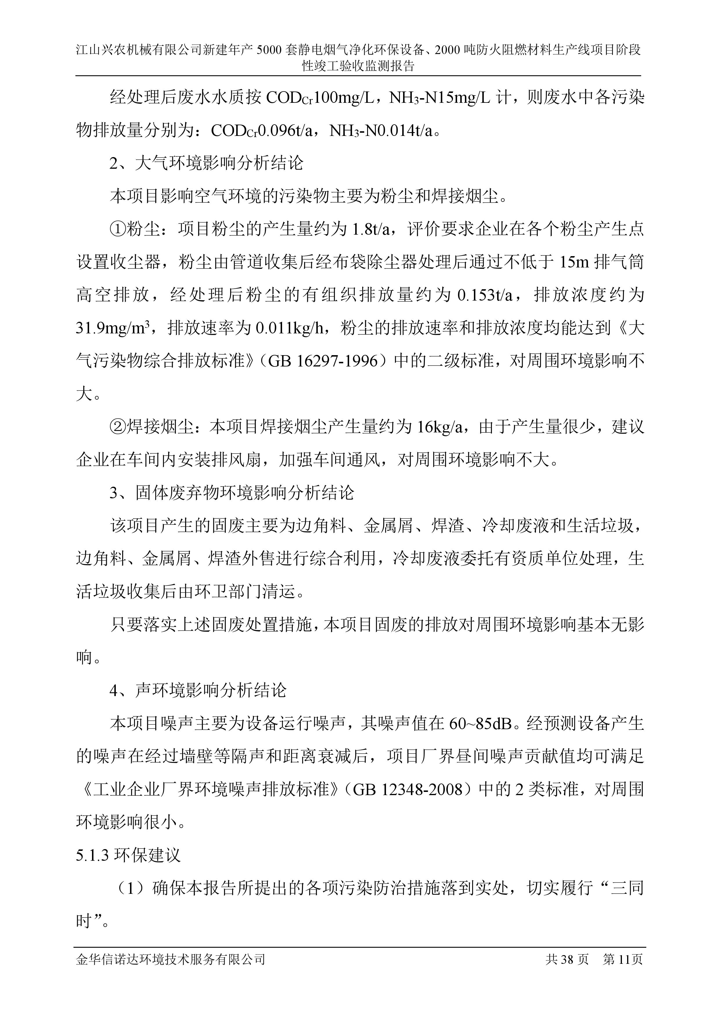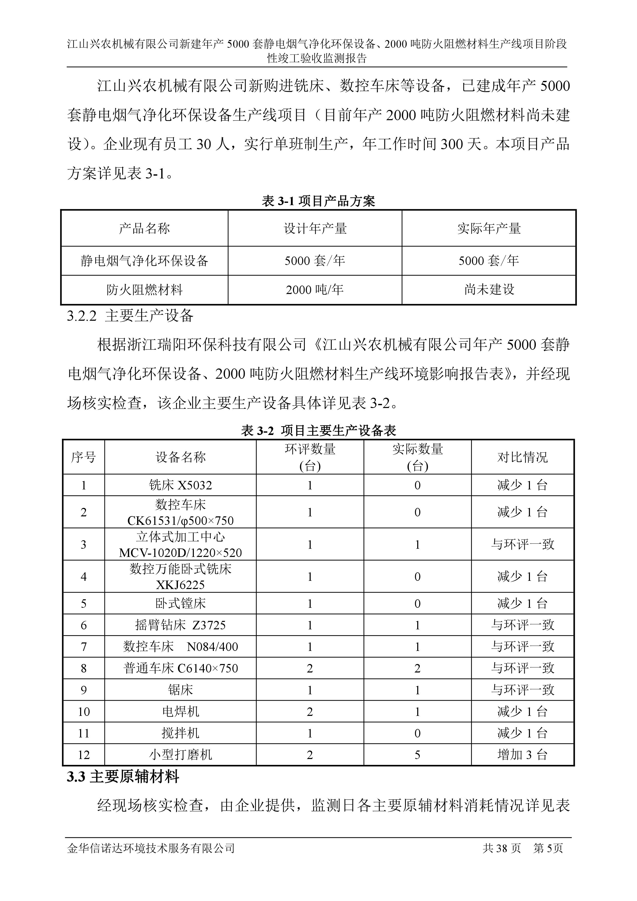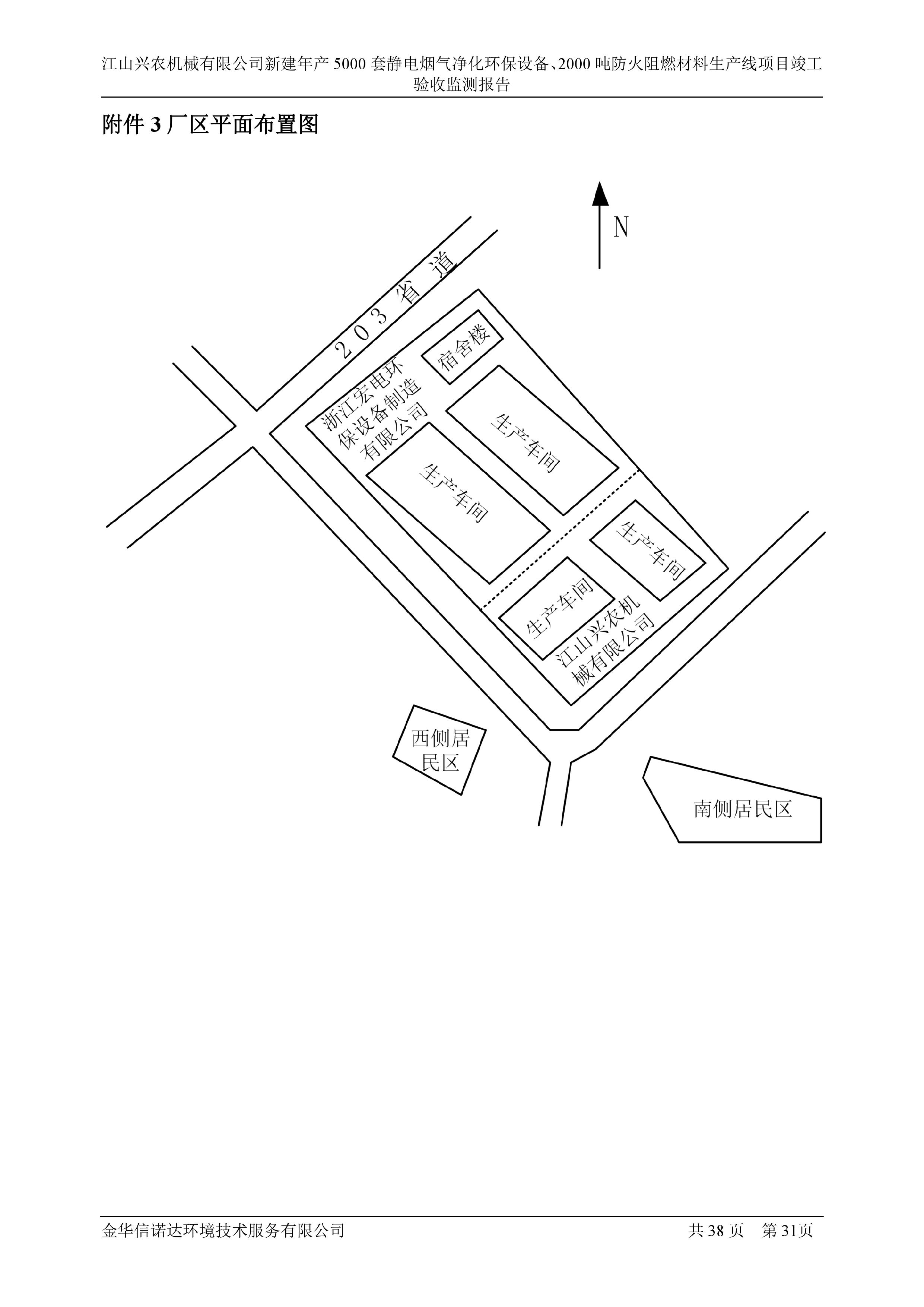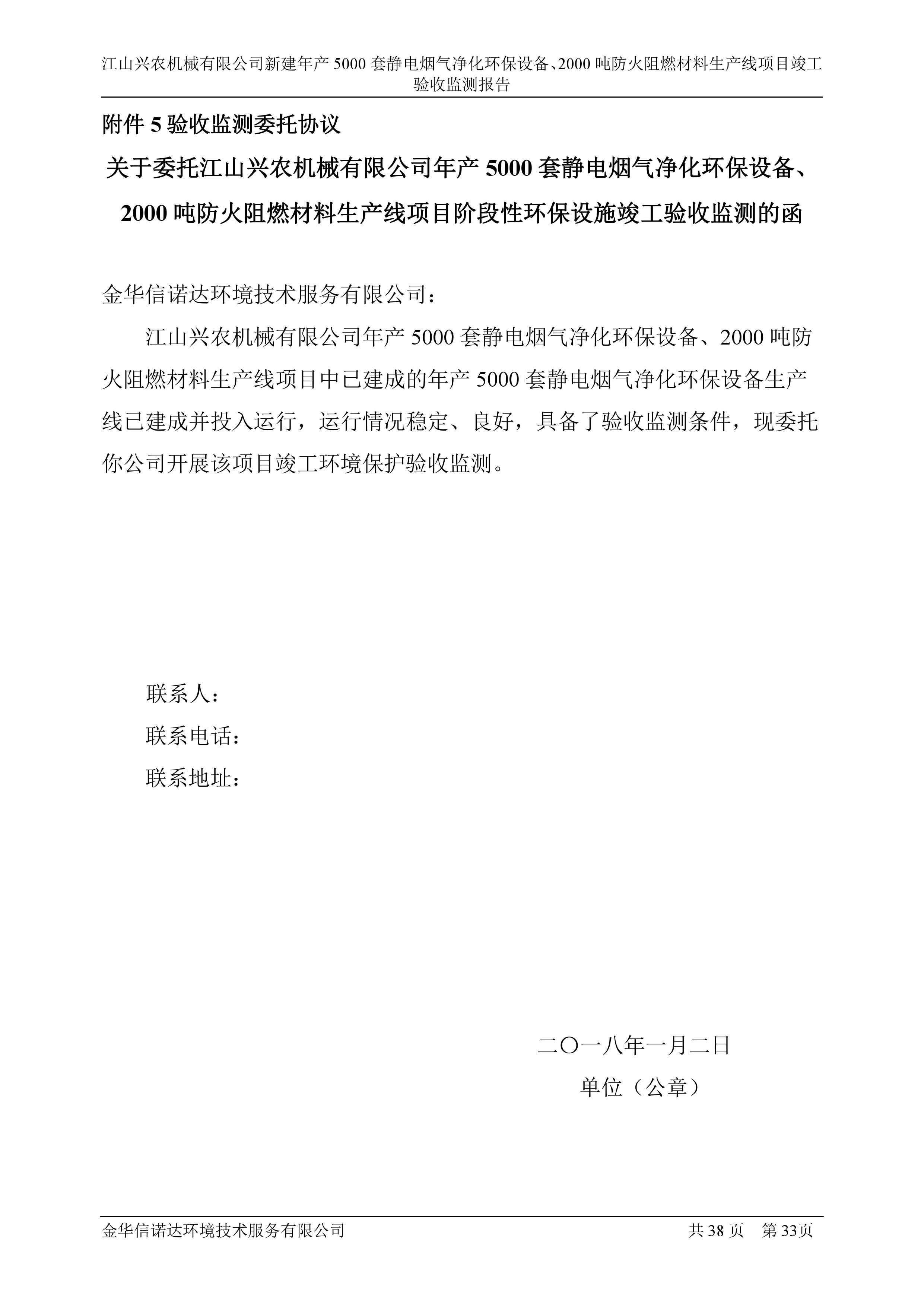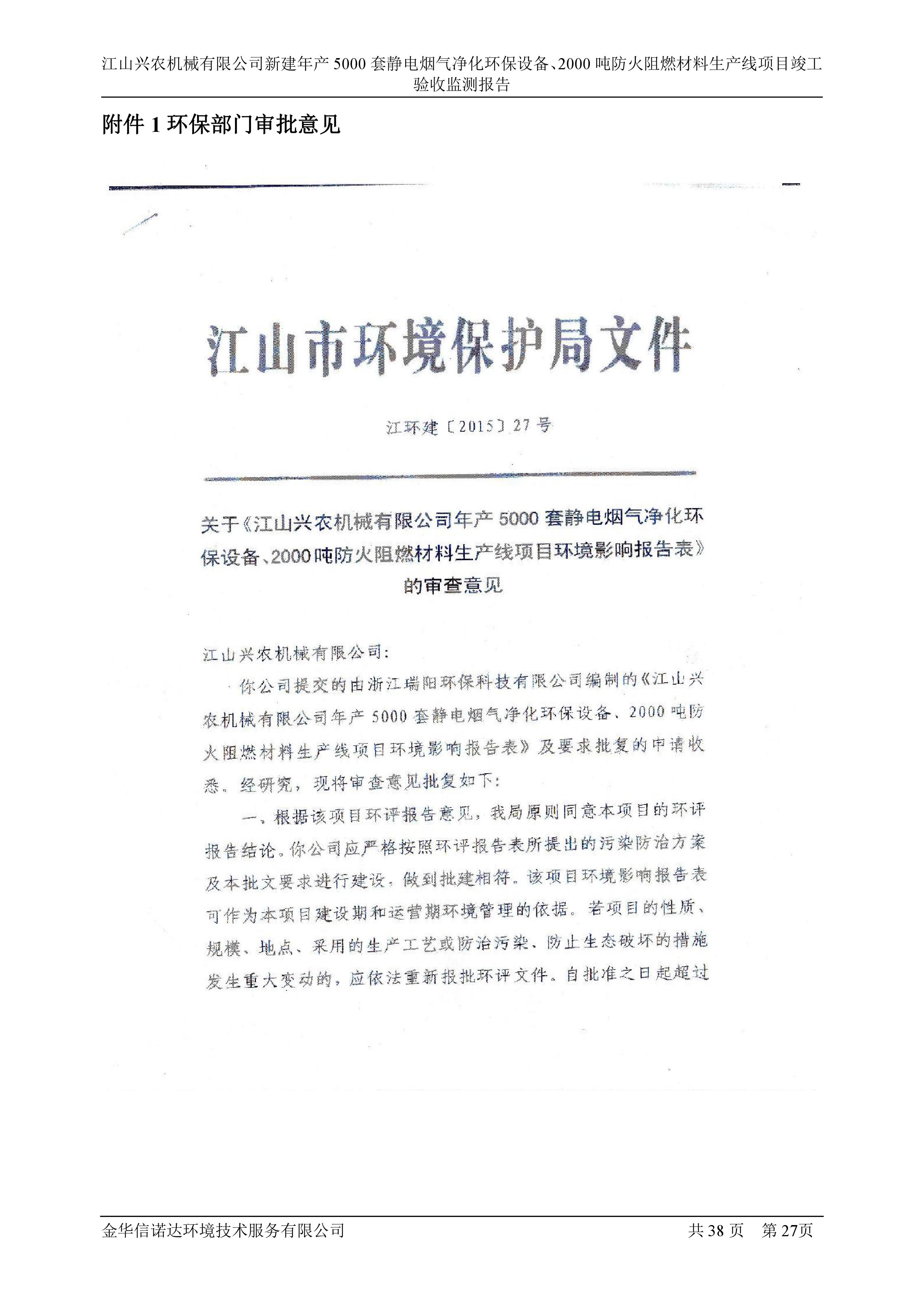 江山興農機械有限公司年產5000套靜電煙氣凈化環保設備、2000噸防火阻燃材料生產線項目階段性竣工環境保護驗收監測報告公示