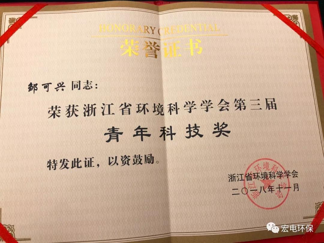 宏電環(huán)保董事長(zhǎng)鄒可興喜獲浙江省環(huán)境科學(xué)第三屆“青年科技獎(jiǎng)”